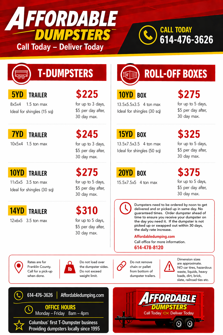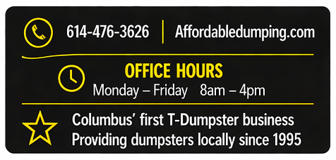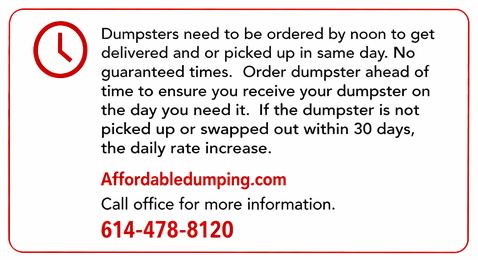 Affordable Dumpsters has been providing dumpster rental services in Columbus, OH for over 20 years. Our licensed, bonded and insured company is one of the first in the area to provide our customers with fast dumpster delivery and pick up services. You will have the peace of mind knowing that we are a locally owned and ran business. Book your dumpster rental with us today or get more information at (614) 478-8120 .
